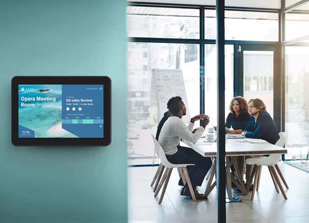 Über die webbasierende Oberfläche können Räume reserviert werden. Die Belegung wird dann rechtzeitig vor dem Meeting auf dem Display angezeigt. Ist bereits ein Buchungssystem vorhanden, z. B. Exchange, Office 365 oder die G.Suite, so können beide Systeme verbunden werden. Eine doppelte Datenpflege entfällt und die Anwender können die gewohnte Buchungs-oberfläche (z. B. Outlook) weiterhin nutzen. Natürlich klappt auch der umgekehrte Weg. Wird ein Raum direkt vor Ort für ein spontanes Meeting am Touchscreen gebucht, wird die Belegung automatisch angezeigt